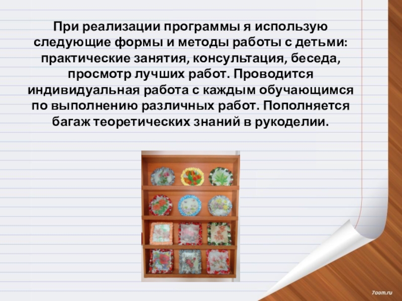 детьми: практические занятия, консультация, беседа, просмотр лучших работ. Проводится индивидуальная работа с каждым обучающимся по выполнению различных работ. Пополняется багаж теоретических знаний в рукоделии.