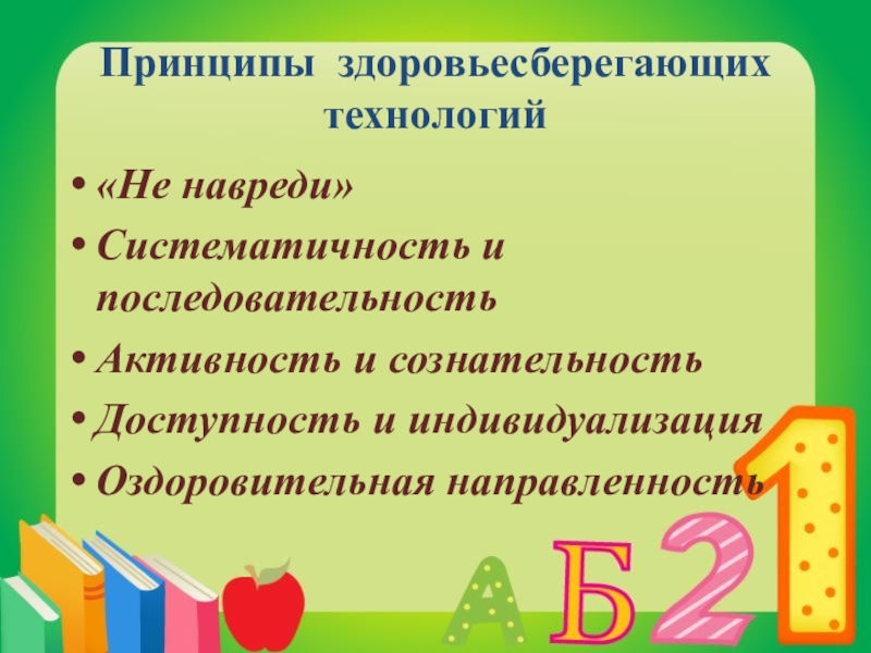 Принципы здоровьесберегающих технологий«Не навреди» Систематичность и последовательность Активность и сознательностьДоступность и индивидуализация Оздоровительная направленность