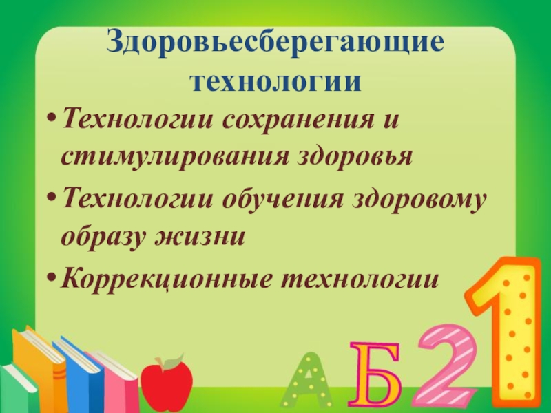 Здоровьесберегающие технологииТехнологии сохранения и стимулирования здоровьяТехнологии обучения здоровому образу жизниКоррекционные технологии
