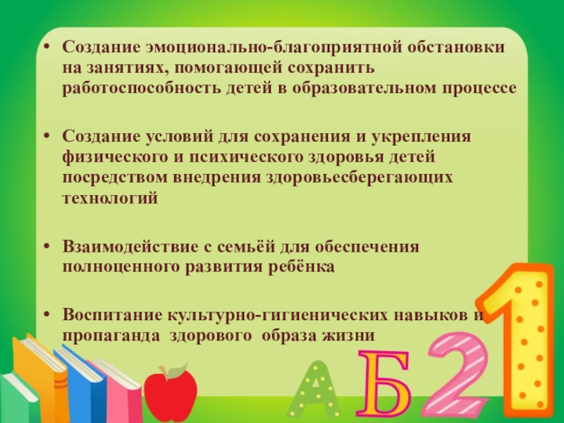 Создание эмоционально-благоприятной обстановки на занятиях, помогающей сохранить работоспособность детей в образовательном процессеСоздание условий для сохранения и укрепления