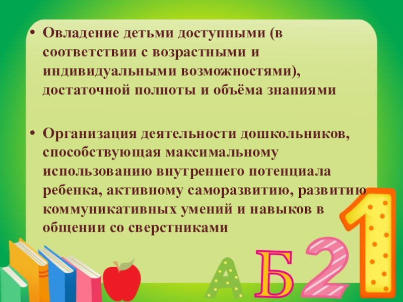 Овладение детьми доступными (в соответствии с возрастными и индивидуальными возможностями), достаточной полноты и объёма знаниямиОрганизация деятельности дошкольников, способствующая максимальному использованию внутреннего по­тенциала ребенка, активному саморазвитию, развитию коммуникативных умений и навыков в общении со сверстниками