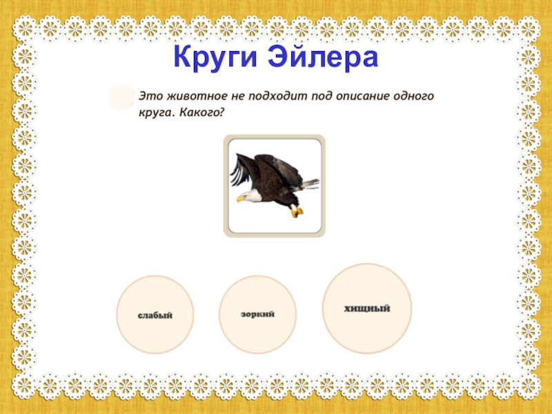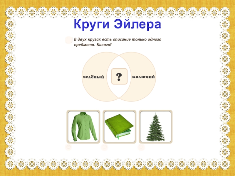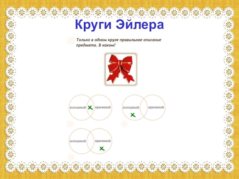 Круги ЭйлераСуществуют несколько моделей кругов:а) Непересекающиеся круги; б) Пересекающиеся круги; в) Один круг вложен в другой