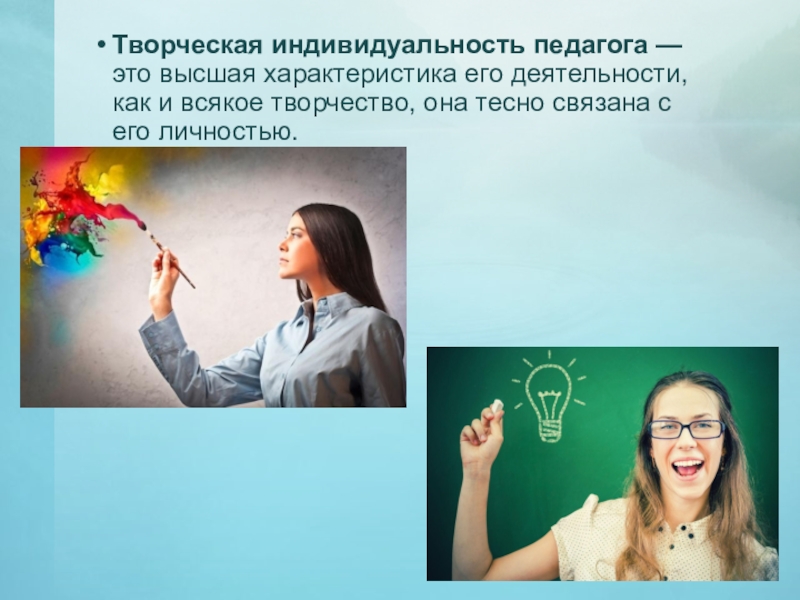 Слайд 6Творческая индивидуальность педагога — это высшая характеристика его деятельности, как и