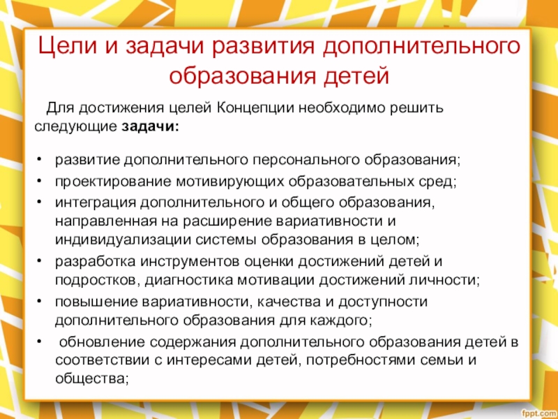 Слайд 9Цели и задачи развития дополнительного образования детей