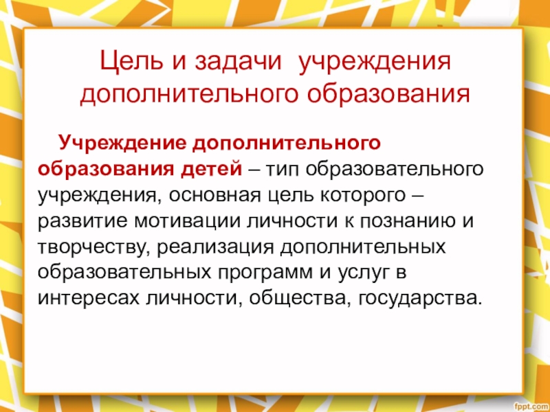 – тип образовательного учреждения, основная цель которого – развитие мотивации личности к познанию и творчеству, реализация дополнительных образовательных программ и услуг в интересах личности, общества, государства.