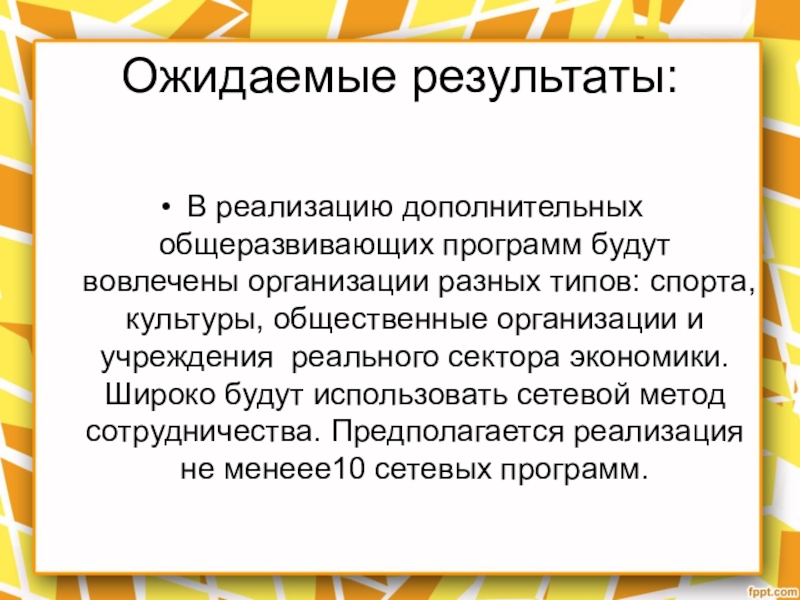 спорта, культуры, общественные организации и учреждения реального сектора экономики. Широко будут использовать сетевой метод сотрудничества. Предполагается реализация не менеее10 сетевых программ.