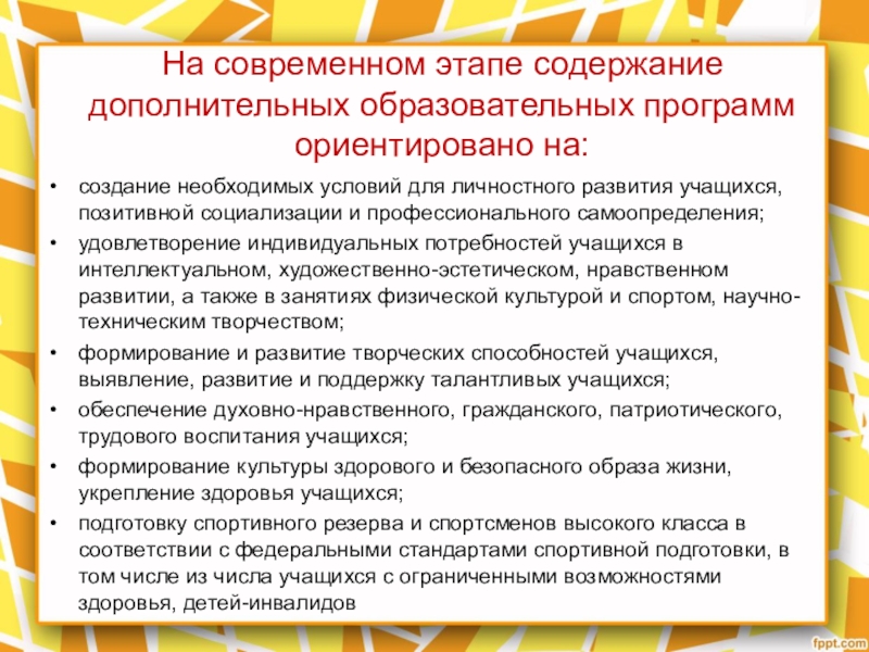 Слайд 10На современном этапе содержание дополнительных образовательных программ ориентировано на: