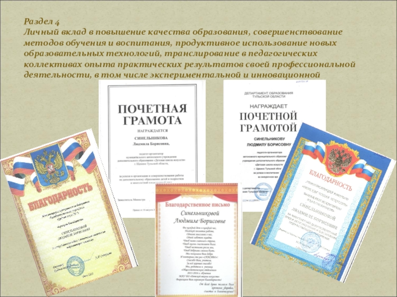 Личный вклад в повышение качества образования, совершенствование методов обучения и воспитания, продуктивное использование новых образовательных технологий, транслирование в педагогических коллективах опыта практических результатов своей профессиональной деятельности, в том числе экспериментальной и инновационной