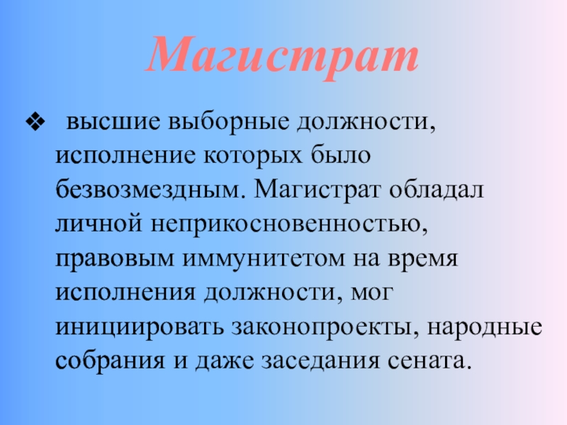 Магистрат высшие выборные должности, исполнение которых было безвозмездным. Магистрат обладал личной неприкосновенностью, правовым иммунитетом на время исполнения