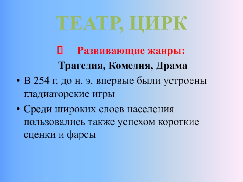 ТЕАТР, ЦИРК  Развивающие жанры: Трагедия, Комедия, Драма В 254 г. до н. э. впервые были устроены