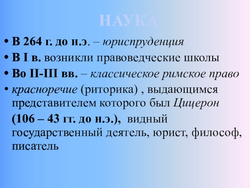 НАУКА В 264 г. до н.э. – юриспруденцияВ I в. возникли правоведческие школыВо II-III вв. – классическое римское правокрасноречие (риторика)