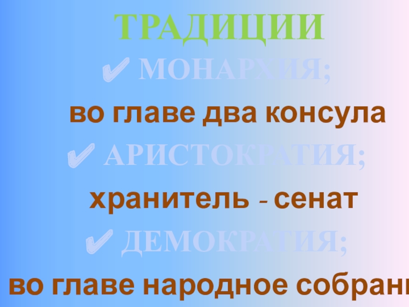 ТРАДИЦИИ МОНАРХИЯ; во главе два консула АРИСТОКРАТИЯ; хранитель - сенат ДЕМОКРАТИЯ; во главе народное собрание