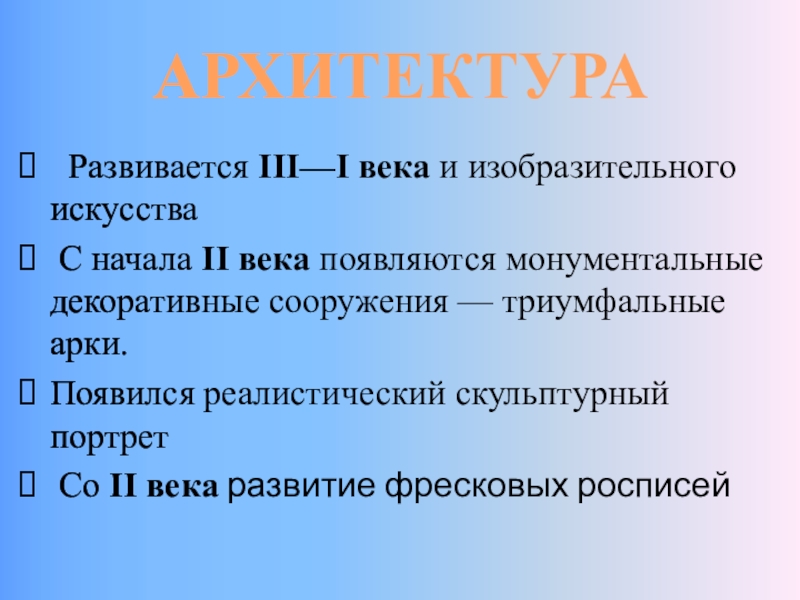 АРХИТЕКТУРА Развивается III—I века и изобразительного искусства С начала II века появляются монументальные декоративные сооружения — триумфальные арки.Появился