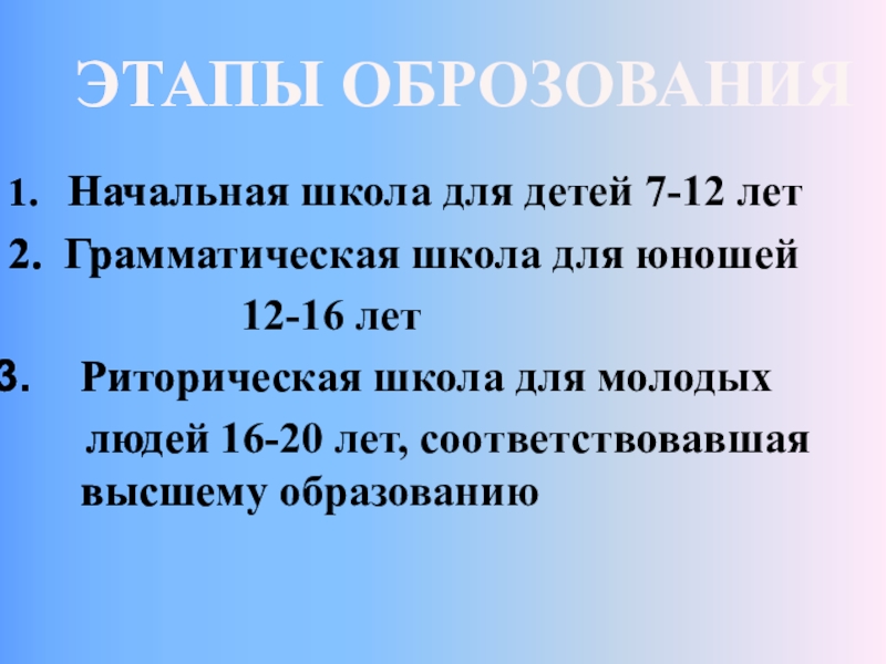 ЭТАПЫ ОБРОЗОВАНИЯ1.  Начальная школа для детей 7-12 лет2. Грамматическая школа для юношей