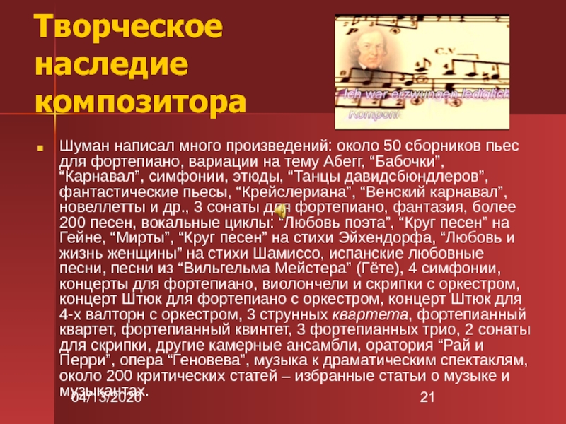 Его творчество – одна из вершин мирового музыкального искусства XIX в.
