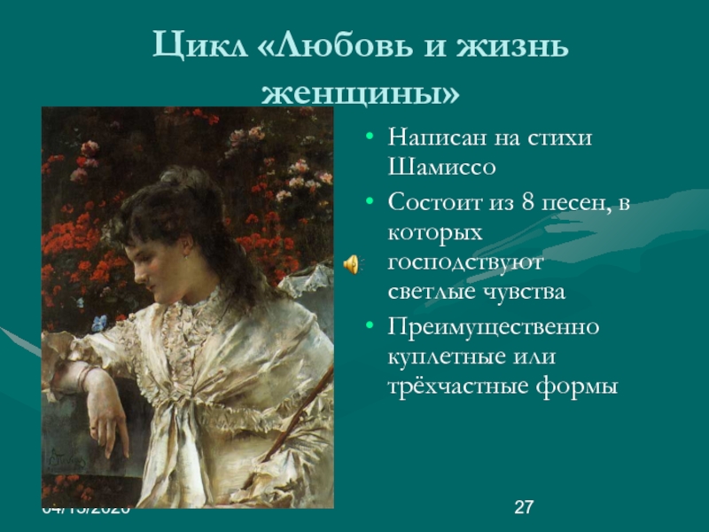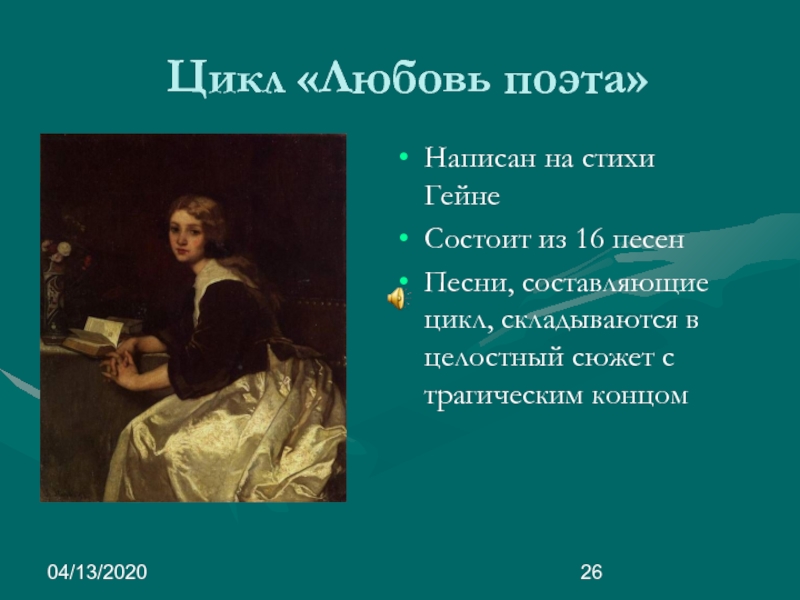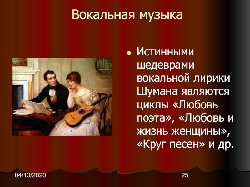 Истинными шедеврами вокальной лирики Шумана являются циклы «Любовь поэта», «Любовь