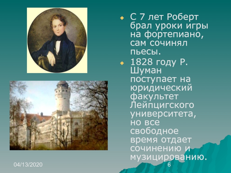 1828 году Р. Шуман поступает на юридический факультет Лейпцигского университета, но все свободное время отдает сочинению и музицированию.