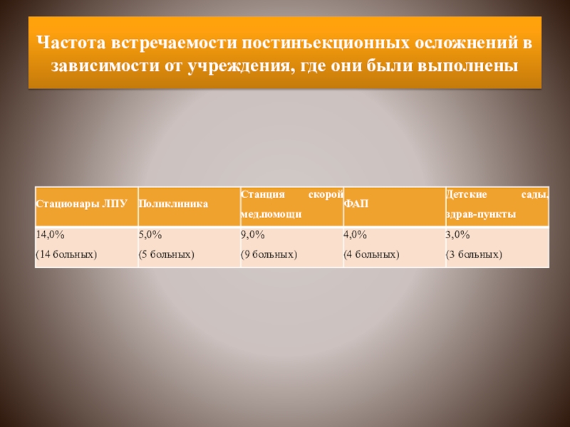 Слайд 7Частота встречаемости постинъекционных осложнений в зависимости от учреждения, где они были