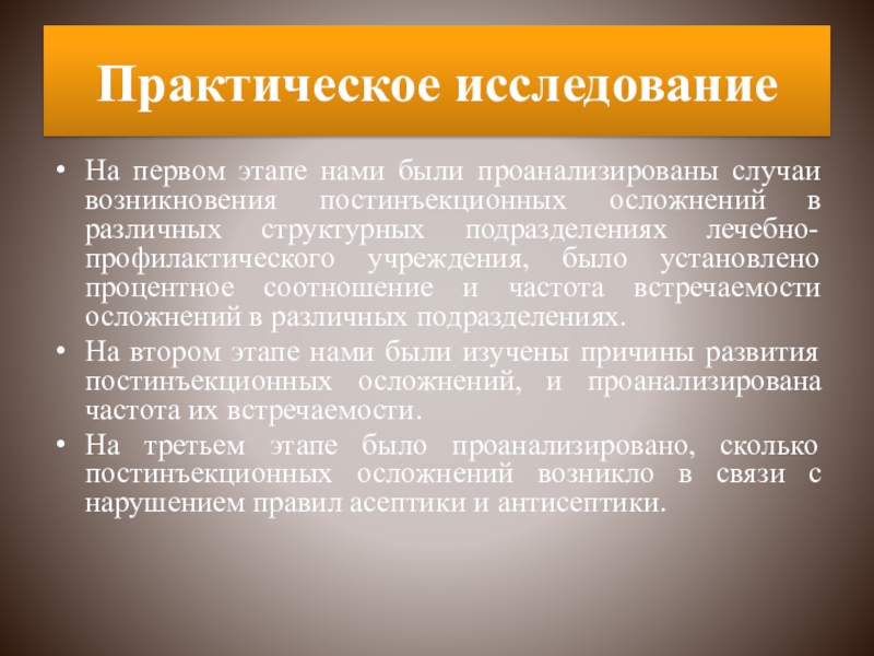 На третьем этапе было проанализировано, сколько постинъекционных осложнений возникло в связи с нарушением правил асептики и антисептики.