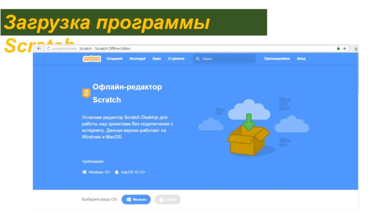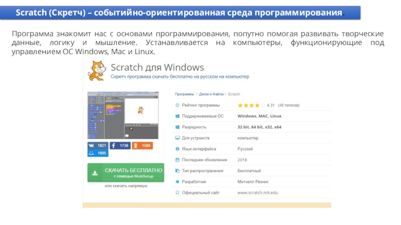 Scratch (Скретч) – событийно-ориентированная среда программирования.Программа знакомит нас с основами программирования, попутно помогая развивать творческие данные, логику и мышление. Устанавливается на компьютеры, функционирующие под управлением ОС Windows, Mac и Linux.
