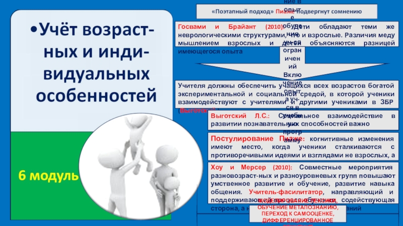 Хоу и Мерсер (2010): Совместные мероприятия разновозраст-ных и разноуровневых групп повышают умственное развитие и обучение, развитие навыка общения. Учитель-фасилитатор, направляющий и поддерживающий процесс обучения, содействующая сторона, а не единственный источник знаний