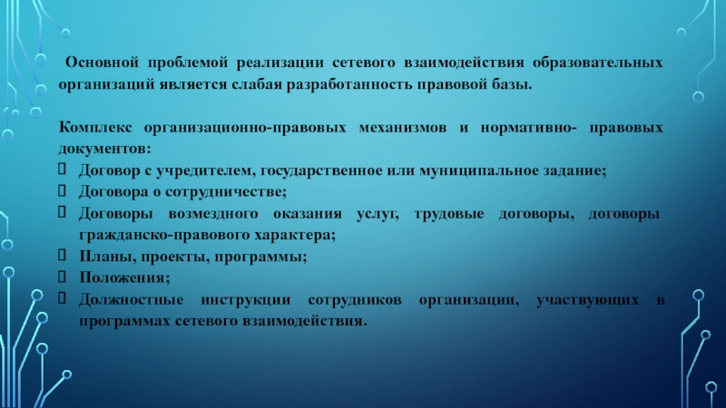 Слайд 6 Основной проблемой реализации сетевого взаимодействия образовательных организаций является слабая разработанность