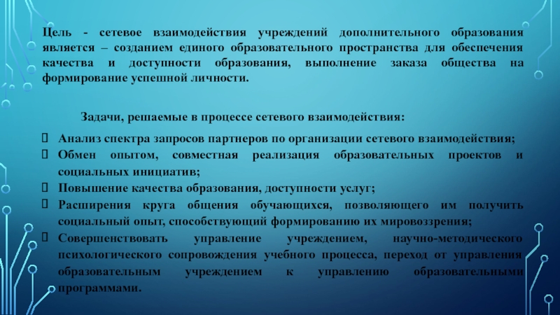 Слайд 4Цель - сетевое взаимодействия учреждений дополнительного образования является – созданием единого