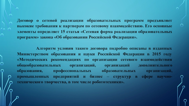 по сетевому взаимодействию. Его основные элементы определяет 15 статья «Сетевая форма реализации образовательных программ» закона «Об образовании Российской Федерации».