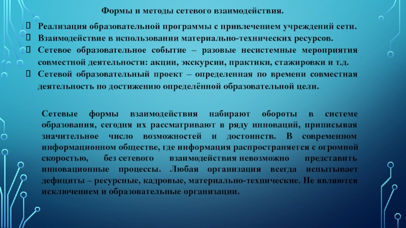 Сетевые формы взаимодействия набирают обороты в системе образования, сегодня их рассматривают в ряду инноваций, приписывая значительное число возможностей и достоинств. В современном информационном обществе, где информация распространяется с огромной скоростью, без сетевого взаимодействия невозможно представить инновационные процессы. Любая организация всегда испытывает дефициты – ресурсные, кадровые, материально-технические. Не являются исключением и образовательные организации.