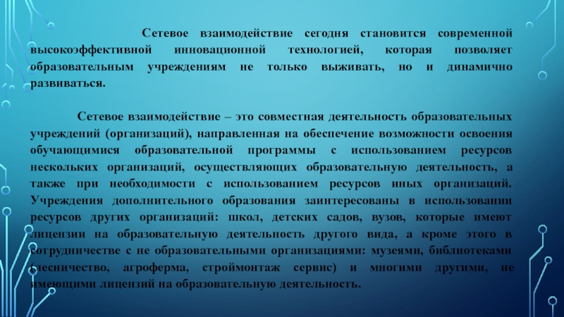Сетевое взаимодействие – это совместная деятельность образовательных учреждений (организаций), направленная на обеспечение возможности освоения обучающимися образовательной программы с использованием ресурсов нескольких организаций, осуществляющих образовательную деятельность, а также при необходимости с использованием ресурсов иных организаций. Учреждения дополнительного образования заинтересованы в использовании ресурсов других организаций: школ, детских садов, вузов, которые имеют лицензии на образовательную деятельность другого вида, а кроме этого в сотрудничестве с не образовательными организациями: музеями, библиотеками (лесничество, агроферма, строймонтаж сервис) и многими другими, не имеющими лицензий на образовательную деятельность.