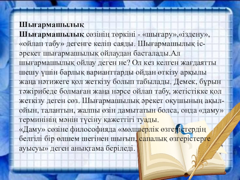 Шығармашылық іс-әрекет шығармашылық ойлаудан басталады.Ал шығармашылық ойлау деген не? Ол кез келген жағдаятты шешу үшін барлық варианттарды ойдан өткізу арқылы жаңа нәтижеге қол жеткізу болып табылады. Демек, бұрын тәжірибеде болмаған жаңа нәрсе ойлап табу, жетістікке қол жеткізу деген сөз. Шығармашылық әрекет оқушының ақыл-ойын, талантын, жалпы өзін дамытатын болса, онда «даму» терминінің мәнін түсіну қажеттігі туады.