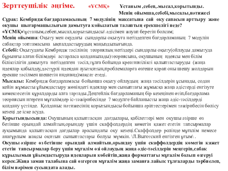 Слайд 22Зерттеушілік әңгіме. «ҰСМҚ» Ұстаным ,себеп,.мысал,қорытынды.