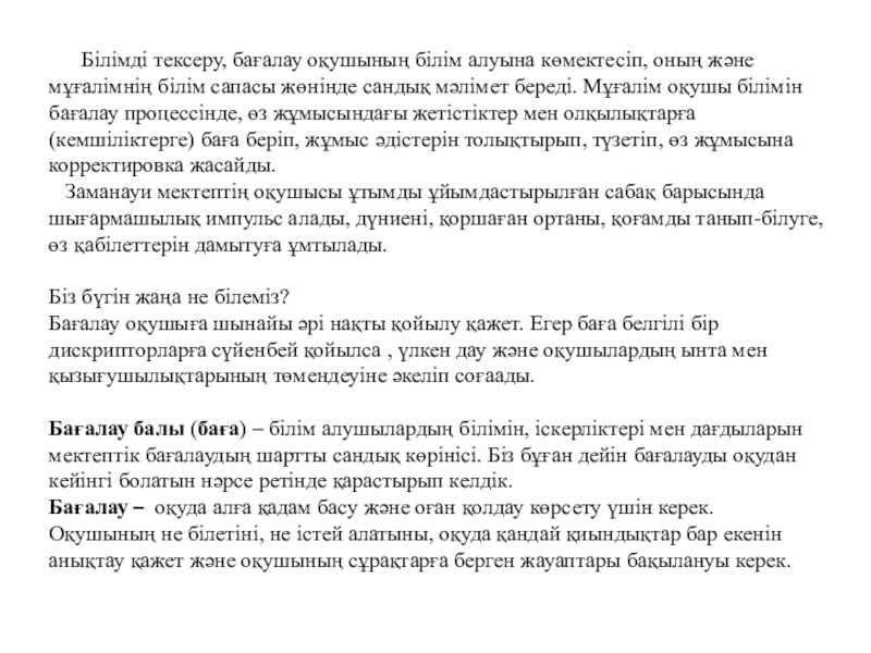 Слайд 28 Білімді тексеру, бағалау оқушының білім алуына көмектесіп, оның