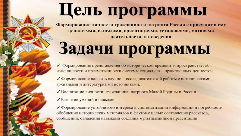✓Формирование навыков научно – исследовательской работы с историческими, архивными и литературными источниками.
