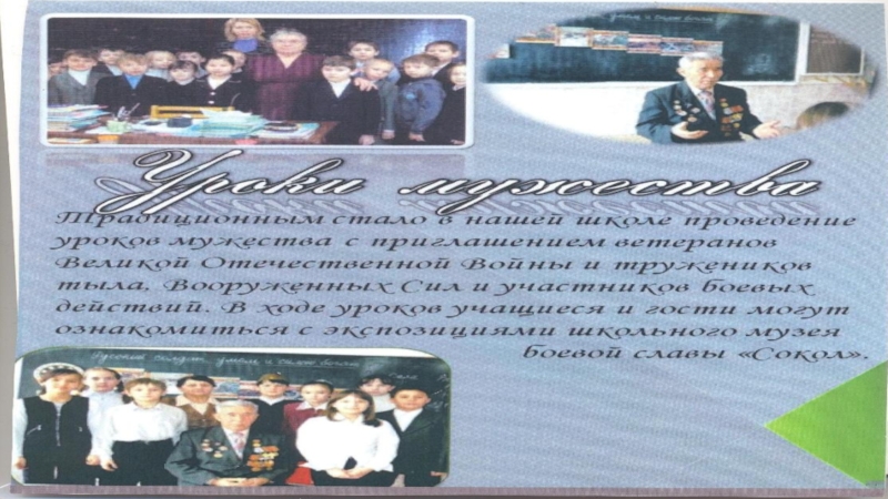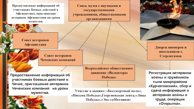 Предоставление информаций об участниках боевых действий в Чечне, приглашение ветеранов Чеченских компаний на уроки мужества.
