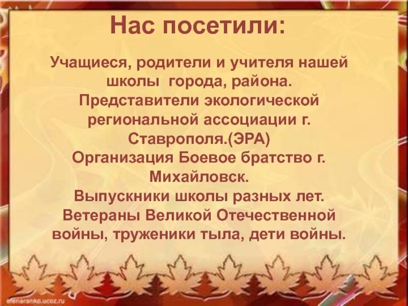 Это сайт презентаций, где можно хранить и обмениваться своими презентациями, докладами, проектами, шаблонами в формате PowerPoint с другими пользователями. Мы помогаем школьникам, студентам, учителям, преподавателям хранить и обмениваться учебными материалами.