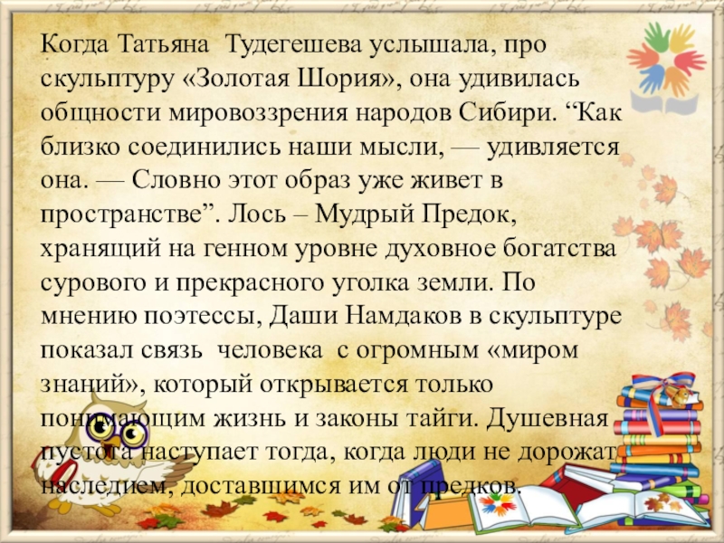 Слайд 10Когда Татьяна Тудегешева услышала, про скульптуру «Золотая Шория», она удивилась общности