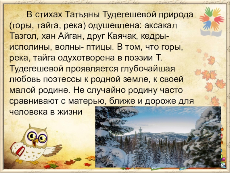 Слайд 13В стихах Татьяны Тудегешевой природа (горы, тайга, река) одушевлена: аксакал Тазгол,