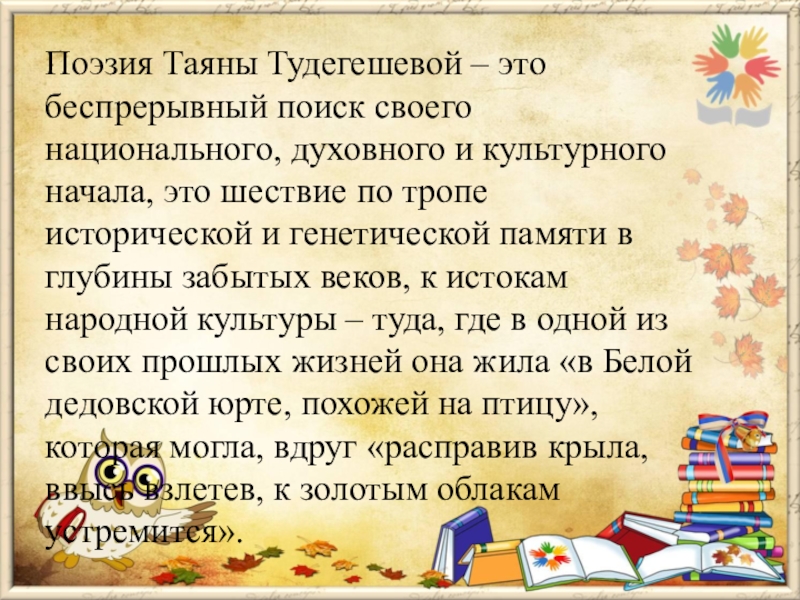 Слайд 7Поэзия Таяны Тудегешевой – это беспрерывный поиск своего национального, духовного и