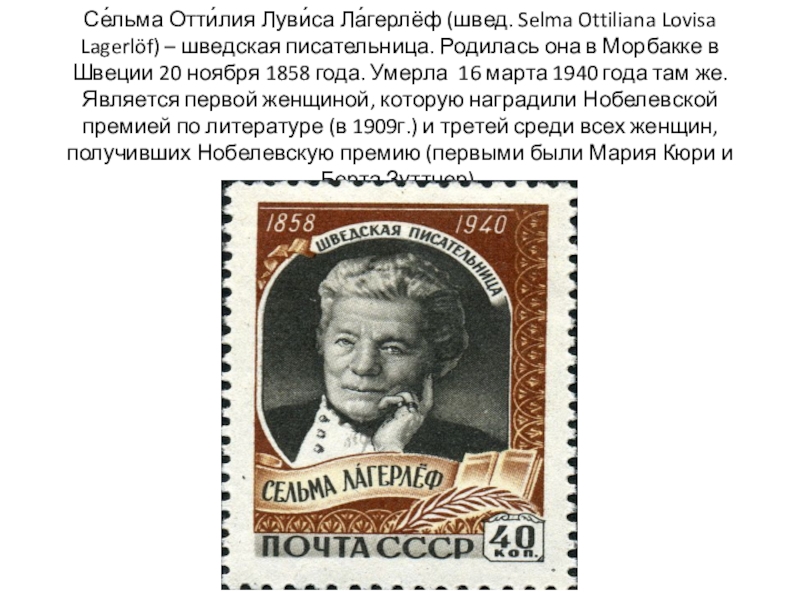 писательница. Родилась она в Морбакке в Швеции 20 ноября 1858 года. Умерла 16 марта 1940 года там же. Является первой женщиной, которую наградили Нобелевской премией по литературе (в 1909г.) и третей среди всех женщин, получивших Нобелевскую премию (первыми были Мария Кюри и Берта Зуттнер).