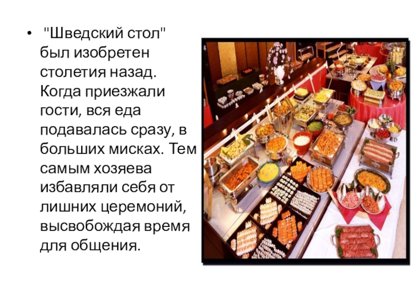 Слайд 11 "Шведский стол" был изобретен столетия назад. Когда приезжали гости, вся еда