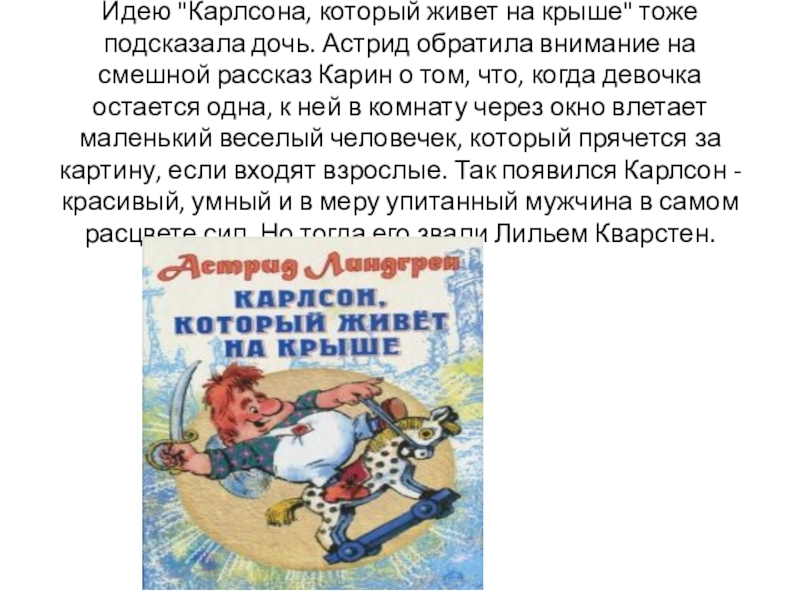 Идею "Карлсона, который живет на крыше" тоже подсказала дочь. Астрид обратила