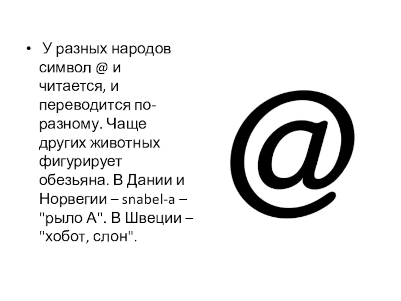 Слайд 13 У разных народов символ @ и читается, и переводится по-разному. Чаще
