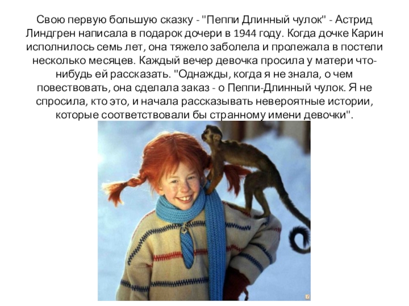написала в подарок дочери в 1944 году. Когда дочке Карин исполнилось семь лет, она тяжело заболела и пролежала в постели несколько месяцев. Каждый вечер девочка просила у матери что-нибудь ей рассказать. "Однажды, когда я не знала, о чем повествовать, она сделала заказ - о Пеппи-Длинный чулок. Я не спросила, кто это, и начала рассказывать невероятные истории, которые соответствовали бы странному имени девочки".