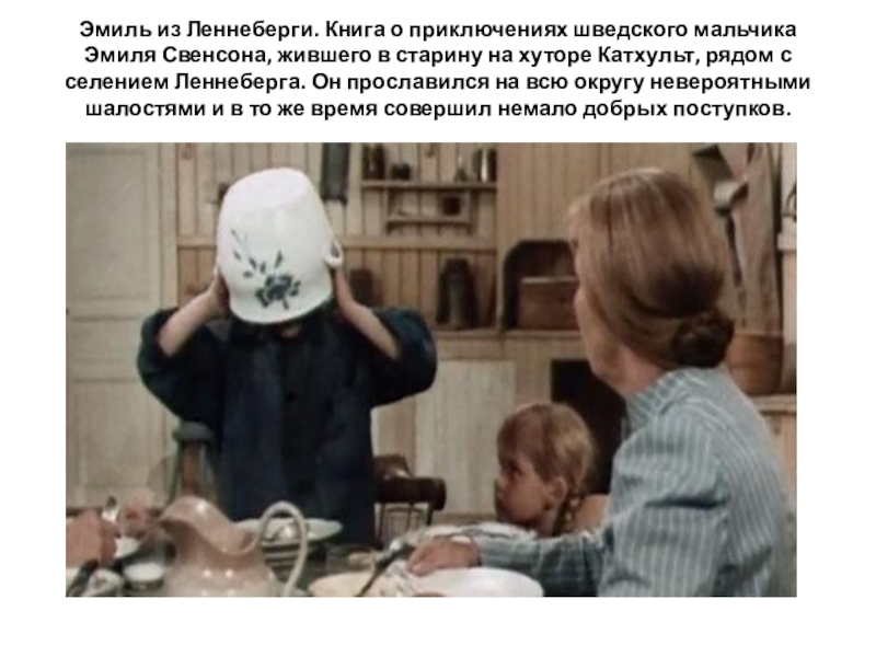 Слайд 34Эмиль из Леннеберги. Книга о приключениях шведского мальчика Эмиля Свенсона, жившего