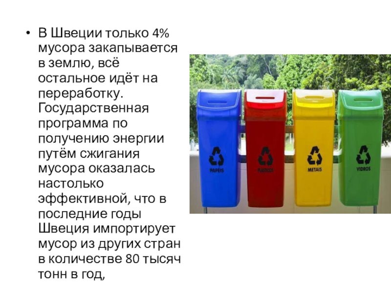 Слайд 14В Швеции только 4% мусора закапывается в землю, всё остальное идёт
