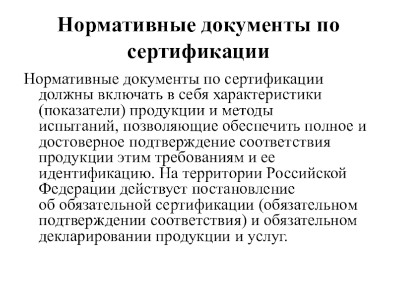 Нормативные документы по сертификацииНормативные документы по сертификации должны включать в себя характеристики (показатели) продукции и методы испытаний, позволяющие