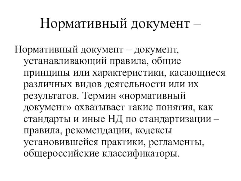Нормативный документ –Нормативный документ – документ, устанавливающий правила, общие принципы или характеристики, касающиеся различных видов деятельности или