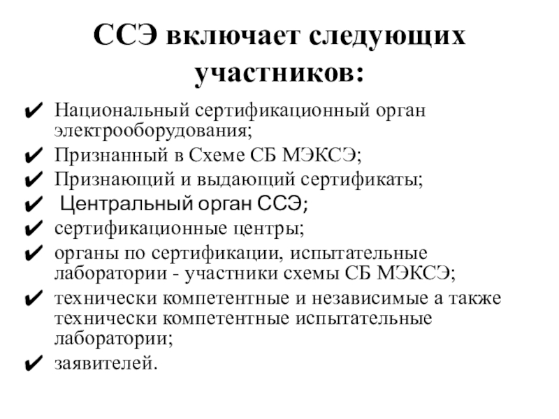 ССЭ включает следующих участников:Национальный сертификационный орган электрооборудования;Признанный в Схеме СБ МЭКСЭ;Признающий и выдающий сертификаты; Центральный орган ССЭ;