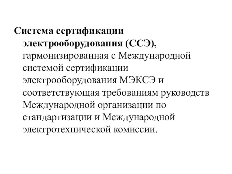 Слайд 3Система сертификации электрооборудования (ССЭ), гармонизированная с Международной системой сертификации электрооборудования МЭКСЭ